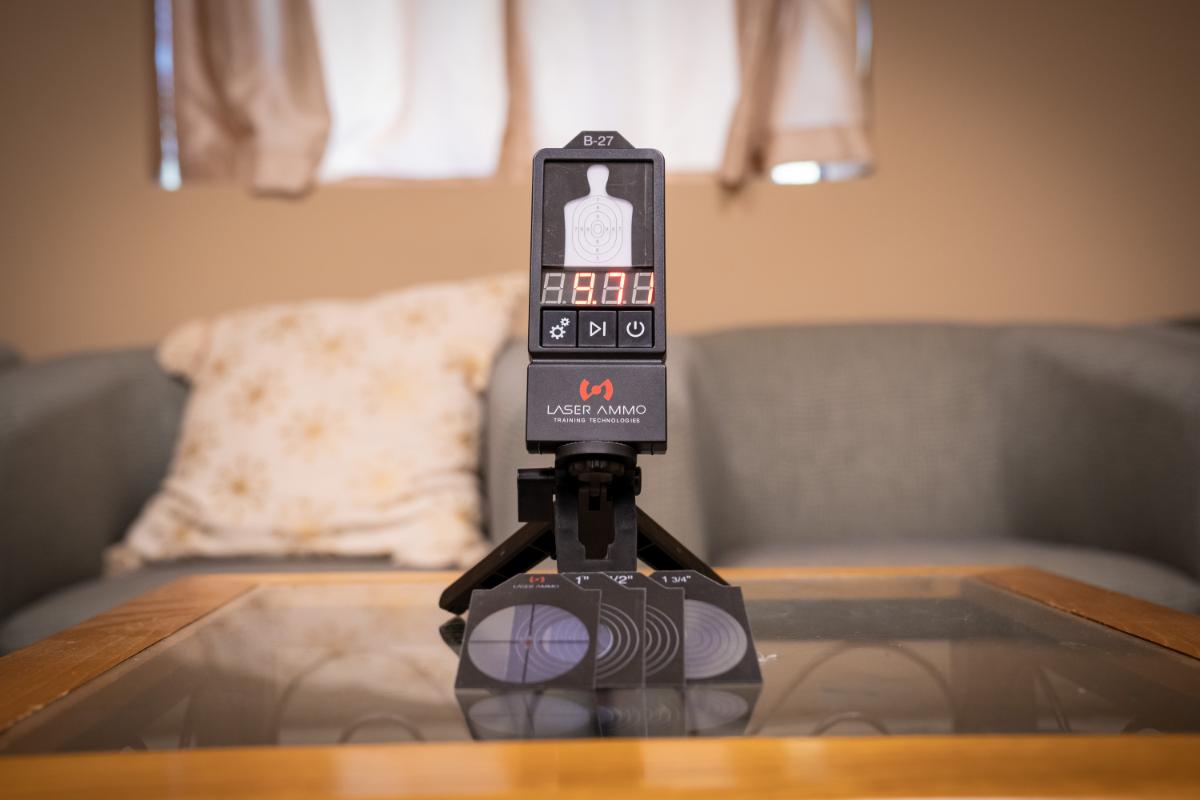 If you want to train with scaled targets at home, there are several great options. Some shooters use printed paper targets, but Laser Ammo electronic targets add instant visual and audible feedback so you can confirm your hits in real time.